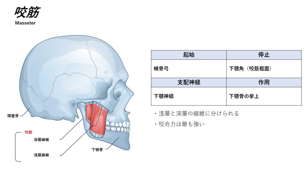今回は咀嚼筋について解説します!咀嚼筋は”噛む”運動に関わる筋で、側頭骨、頬骨、蝶形骨などに起始し、下顎骨に停止します。頭部顔面部の筋の中でも関節運動に関わるのは咀嚼筋だけです。残りの筋は皮筋として表情の形成に関わります!頭部顔面部における関節運動に関わる咀嚼筋についてしっかり学びましょう!!