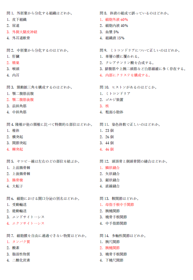 細胞・組織(国家試験対策問題) 2025 5/09 国家試験対策 2024年5月21日2025年5月9日 こんにちは! 今回の投稿は細胞・組織・骨関節についての国家試験対策問題です! スマホ・パソコンで解いてみたい方はコチラ⇩から 4択問題 4択問題 PDFなので、ダウンロード又は印刷をして勉強してみてください! 発生ダウンロード 4択問題解答 国家試験対策 よかったらシェアしてね! URLをコピーしました! URLをコピーしました! コメント コメントする コメントをキャンセルコメント ※ 名前 ※ メール ※ サイト 次回のコメントで使用するためブラウザーに自分の名前、メールアドレス、サイトを保存する。 Δ