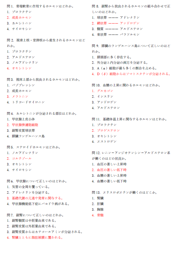 内分泌の解剖学・生理学(国家試験対策問題) 2024 7/26 国家試験対策 2024年7月1日2024年7月26日 こんにちは!内分泌の解剖学・生理学の国家試験対策問題を作成しました。 国家試験を控える学生さん、または解剖学・生理学を学び始めた学生さんに使っていただければ幸いです。 スマホ・パソコンで解いてみたい方はコチラ⇩ 4択問題 目次4択問題(ダウンロード可能) 内分泌の解剖 生理学 問題ダウンロード 4択問題解答 国家試験対策 よかったらシェアしてね! URLをコピーしました! URLをコピーしました! コメント コメントする コメントをキャンセルコメント ※ 名前 ※ メール ※ サイト 次回のコメントで使用するためブラウザーに自分の名前、メールアドレス、サイトを保存する。 Δ